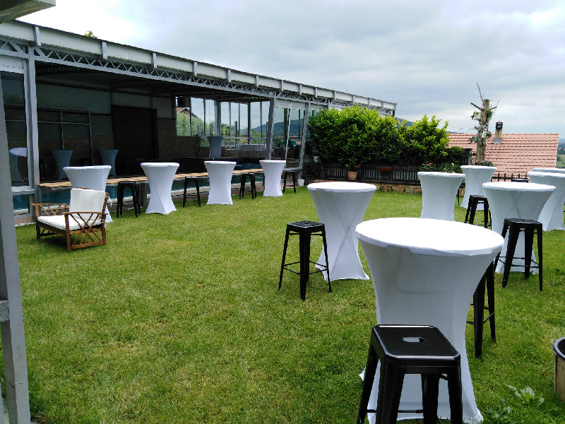 • Okrugli barski stolovi ravnomerno raspoređeni po prostoru, bez stolnjaka ili sa jednostavnim navlakama u boji brenda.