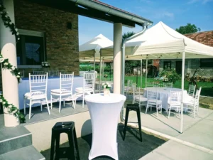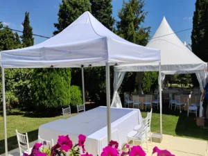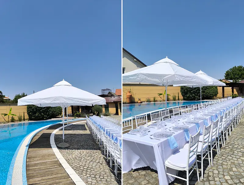 Iznajmljivanje suncobrana tokom letnje sezone i nepredvidivog vremena. Naši gazebo suncobrani imaju četiri stope i dimenzija su 3x3m. Mogu se postaviti na betonu ili travi. Suncobrani su podesivi po visini, iznajmljuju se u dve boje i laki su za rukovanje.