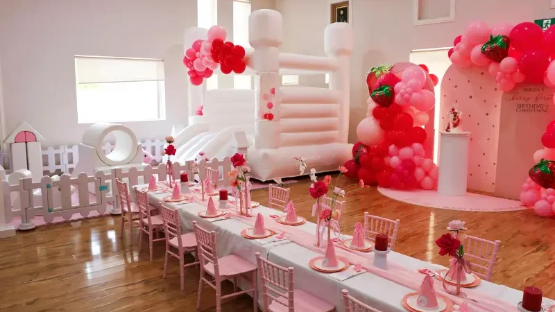 Kombinacija roze Tiffany stolica, belih stolova, zlatnih balona i pastelnih salveta. Idealno za rođendane devojčica i proslave krštenja.